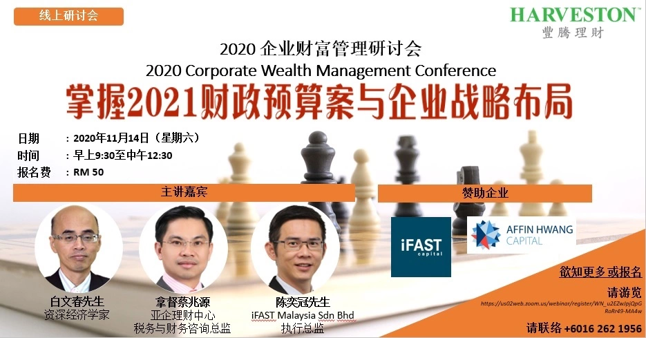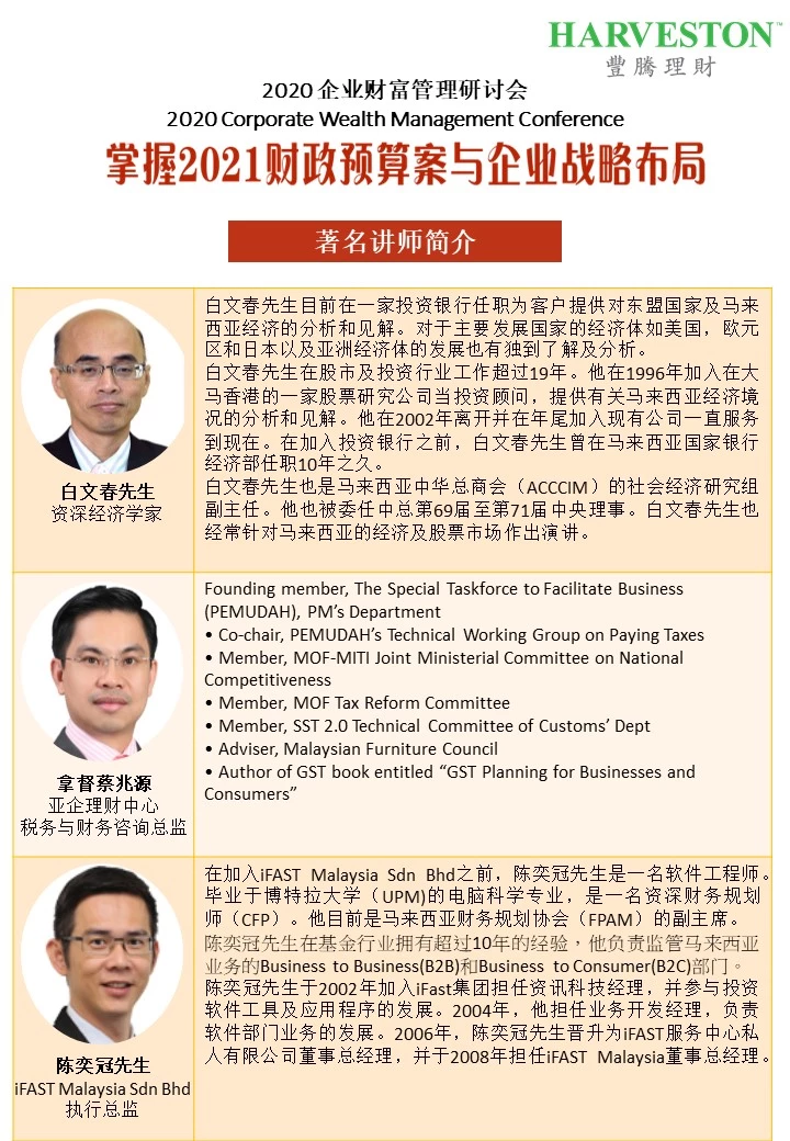 我们的公司, 豐騰理財Harveston Financial Group 将在11月14日(星期六)举办第二届的企业财富管理研讨会 *“掌握2021财务预算案与企业战略布局”* , 大会邀请了著名讲师为与会者分享: